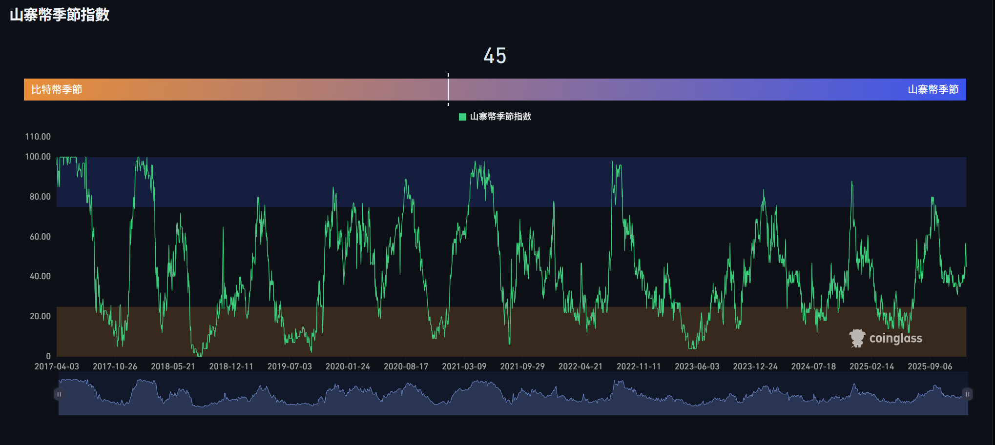 山寨季指标现于45,前番反弹至57后回落,属短期整固,非弱反是蓄力。